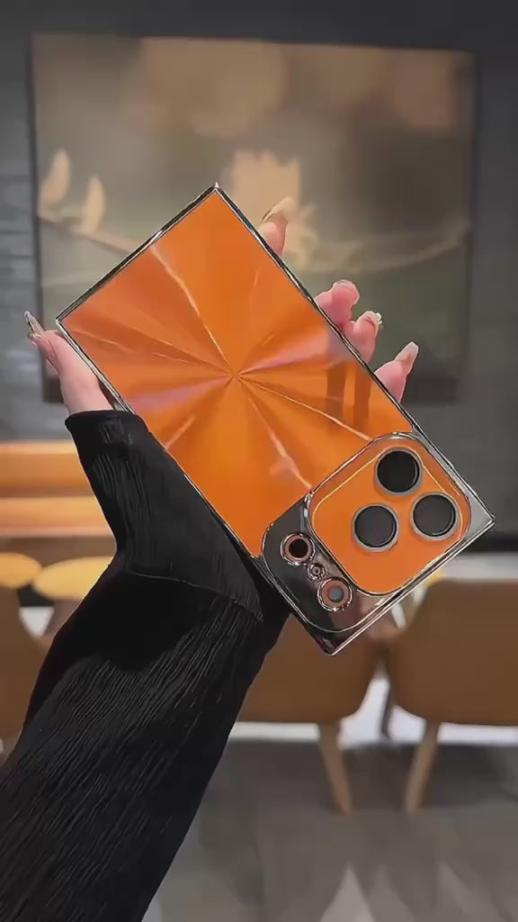This premium protective case is designed to give your iPhone a luxurious and modern aesthetic. The case features a smooth, reflective back plate with an "aurora" effect, where the surface appears to shift and shimmer with a radial light pattern. The back plate is a vibrant orange with a glossy finish. The entire case, including the camera module, is framed with a highly polished, electroplated chrome bumper that provides a mirror-like finish and adds a touch of high-end style. Constructed from a durable, shock-absorbent material, this case offers reliable protection against drops and scratches while maintaining a sleek, minimalist design. The raised camera bezel provides extra defense for the lenses.