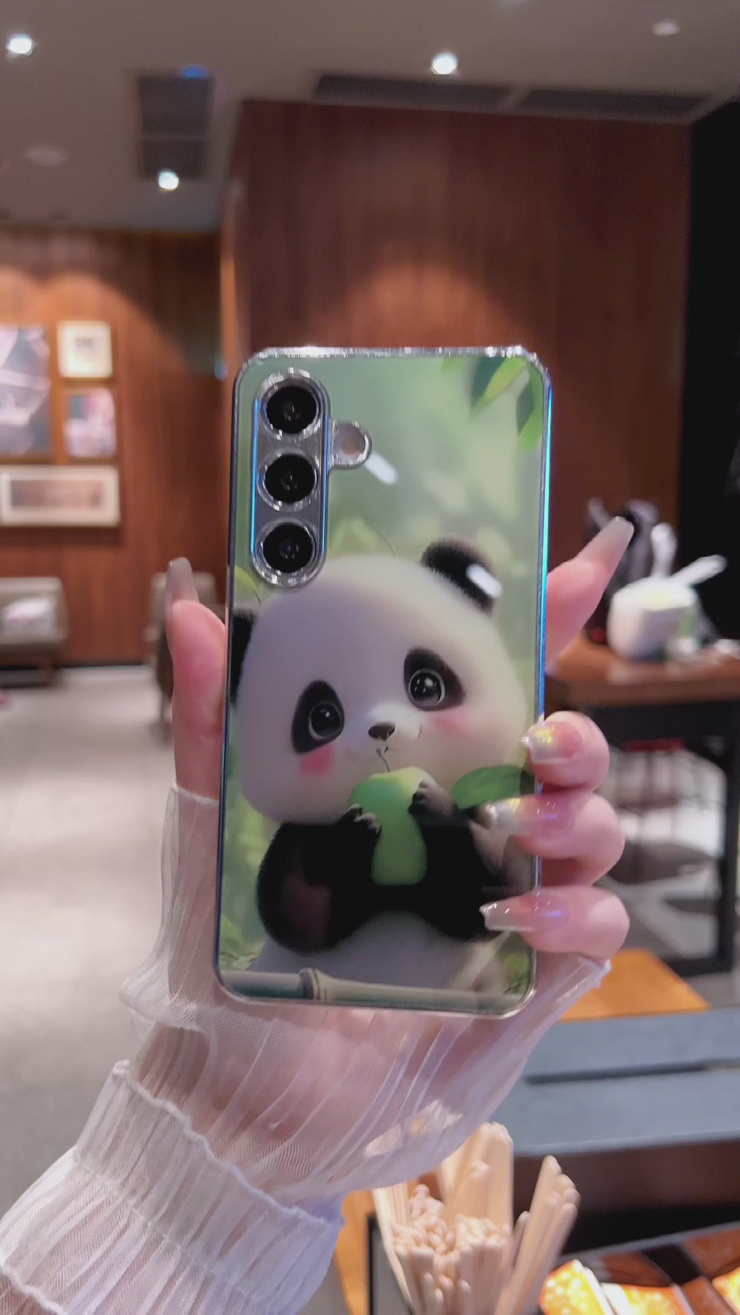 This adorable and protective phone case is designed to give your Samsung Galaxy a cute and whimsical look. The case features a three-dimensional, fluffy-looking cartoon panda with rosy cheeks, holding a green leaf or bamboo shoot. The panda is set against a vibrant green background with a bamboo forest motif. The case has a shiny, electroplated chrome bezel around the camera module and the edges, providing a luxurious, mirror-like finish and enhanced protection. Made from a durable material, this case offers a secure fit and reliable defense against scratches, drops, and daily wear while maintaining a sleek and stylish profile.