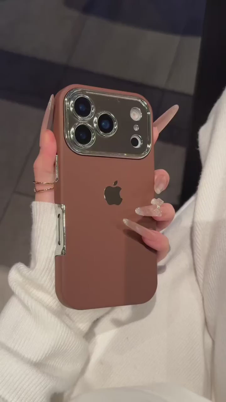 - Design: A minimalist, solid-color design in a matte brown finish, contrasted by a prominent, glossy silver frame around the camera module and a matching piece near the phone's bottom.