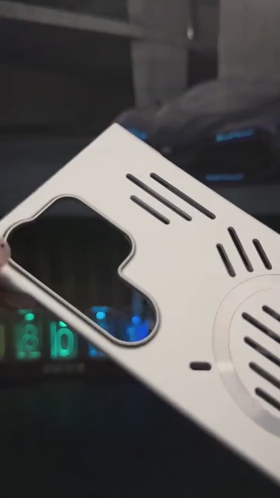 This professional-grade cooling case for the Samsung Galaxy S Series is engineered for optimal thermal management and enhanced device performance. The design features a series of precisely cut ventilation slots on the back panel that promote passive airflow, effectively dissipating heat to prevent the device from overheating during intensive use such as gaming or video streaming. An integrated magnetic ring provides seamless compatibility with MagSafe accessories, offering a secure connection for wireless charging and magnetic mounts. Constructed from a durable, high-quality material, the case provides robust protection against drops and impacts while maintaining a slim, ergonomic profile. The design also includes raised bezels to protect the camera lenses and screen from scratches and damage.