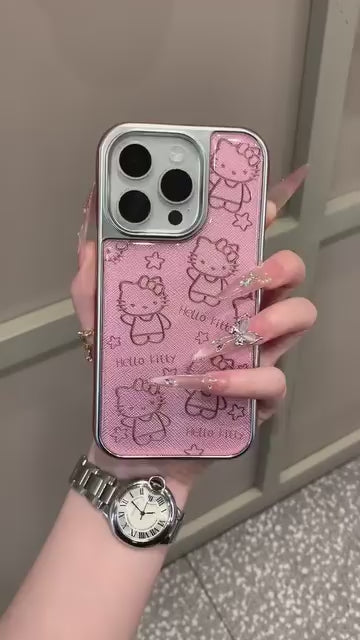 Elevate your device's style with this charming , blending nostalgic charm with modern protection. The case features a vibrant, glitter-infused pink back panel adorned with classic black line-art drawings of Hello Kitty and stars.