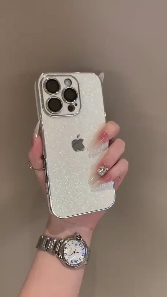 This elegant and protective phone case is designed to enhance the style of your iPhone. The case features a transparent back panel filled with a fine, shimmering silver glitter that sparkles as it catches the light. The perimeter of the case, including the camera module, is finished with a reflective silver chrome electroplating, adding a luxurious and modern aesthetic. Constructed from a durable, flexible material, this case offers reliable shock absorption and defense against scratches. The raised chrome bezel around the camera provides extra protection for the lenses, while the precise cutouts ensure easy access to all buttons and ports. This case is perfect for those who want to add a touch of glamour and shine to their device.