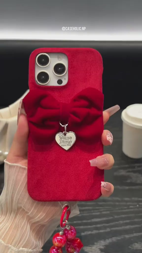 This luxurious phone case for the iPhone is designed to combine a soft, high-end feel with elegant style. The case features a rich, deep red velvet texture that provides a comfortable and secure grip. Adorned with a prominent three-dimensional red bow on the back, the case makes a bold fashion statement. A delicate heart-shaped charm, inscribed with a classic motif, hangs from the bow, adding a touch of personalized elegance. The case is constructed from a durable material with a velvet exterior, offering reliable protection against scratches and minor impacts while maintaining a slim and stylish profile. Its precise cutouts ensure full access to all ports and buttons.