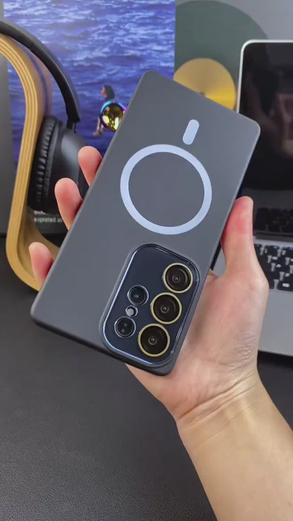 This professional-grade phone case for the Samsung S series features a modern, translucent matte black finish that is both sleek and functional. The case is designed to resist fingerprints and smudges, maintaining a clean look. The case provides robust, military-grade shockproof protection against drops and impacts, with reinforced edges and a raised bezel around the camera module to protect the lenses from scratches.