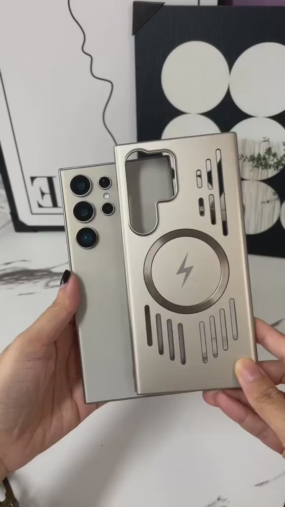 This elegant, gold-plated phone case for the Samsung Galaxy Series combines sophisticated style with robust protection. The case features a smooth, metallic finish and a distinctive linear design. It is equipped with a powerful, built-in magnetic ring on the back that ensures full compatibility with MagSafe chargers and accessories. Constructed from durable materials, the case offers excellent shock absorption and heavy-duty protection against drops and impacts. The design includes a raised bezel around the camera module and the screen to provide enhanced defense against scratches and daily wear.